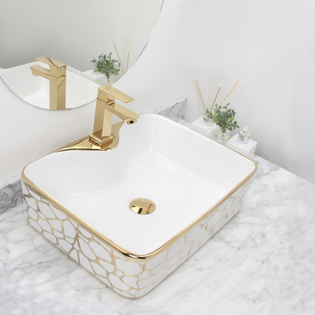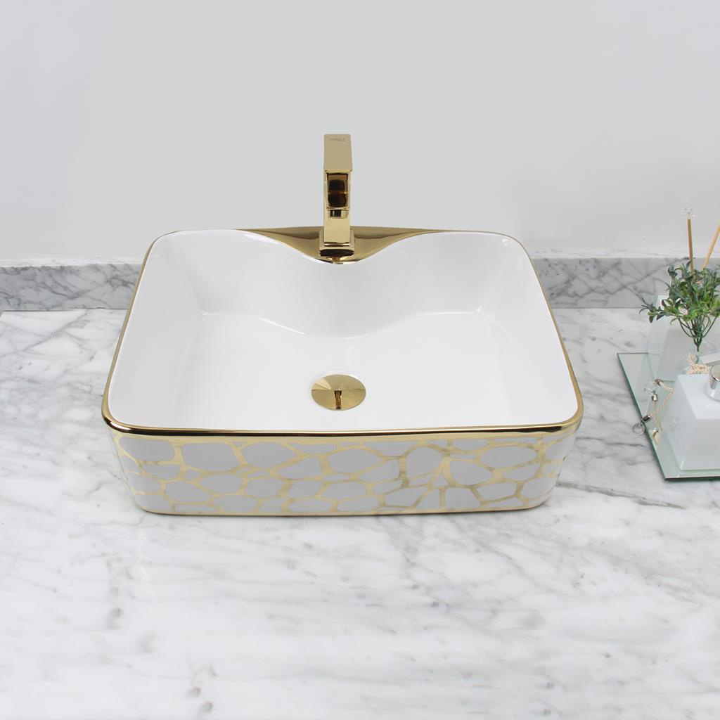 Cuba retangular de sobrepor, em cerâmica de altíssima qualidade. Acabamento esmaltado em branco com detalhes em dourado, indicada para ambientes residenciais e comerciais. Peso aproximado de 10kg, garantindo robustez e durabilidade.